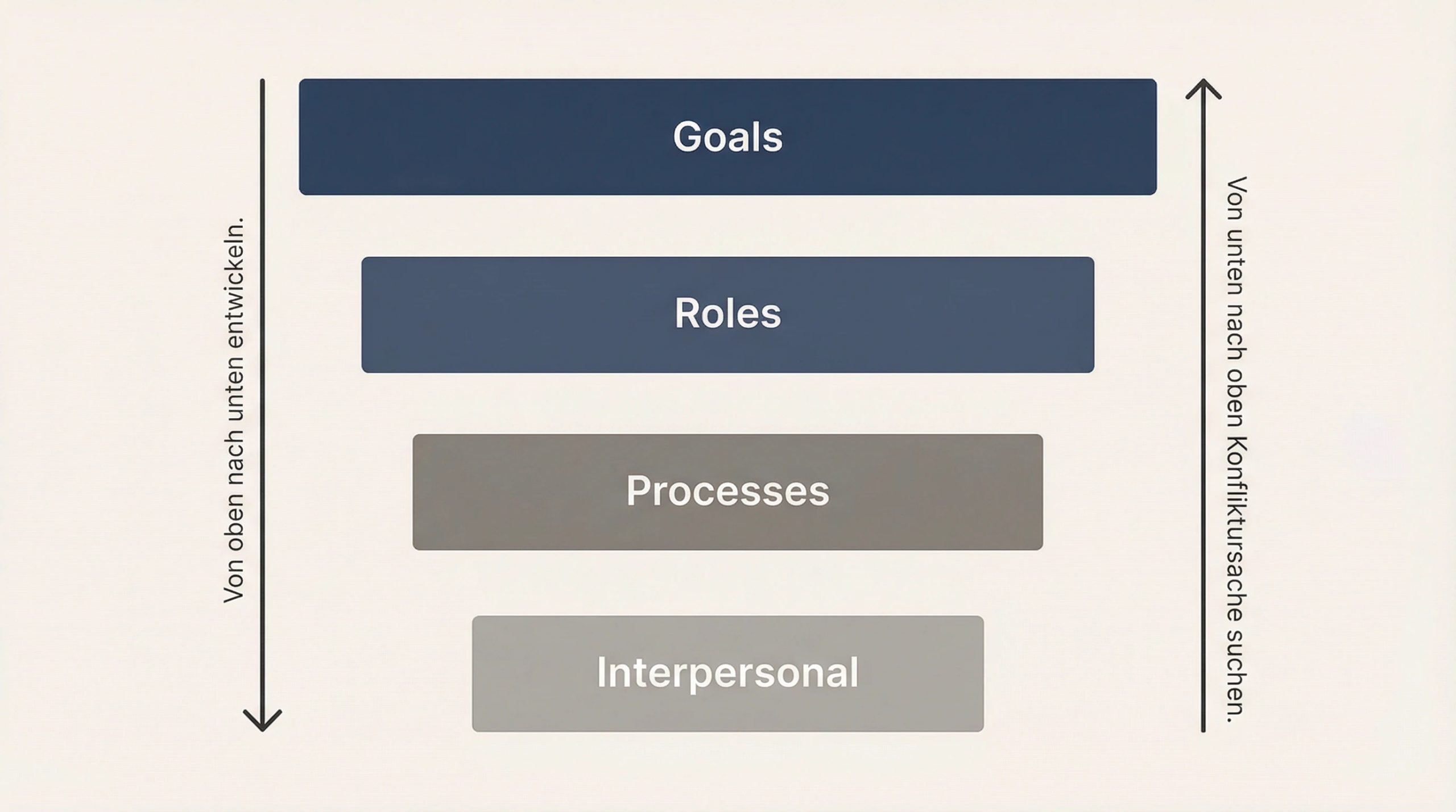 Von unten nach oben diagnostizieren – aber von oben nach unten lösen. Wenn es im Team knirscht, fragen Sie zuerst nach Zielen, dann nach Rollen, dann nach Prozessen. Erst wenn alles drei klar ist, lohnt sich der Blick auf die zwischenmenschliche Ebene.